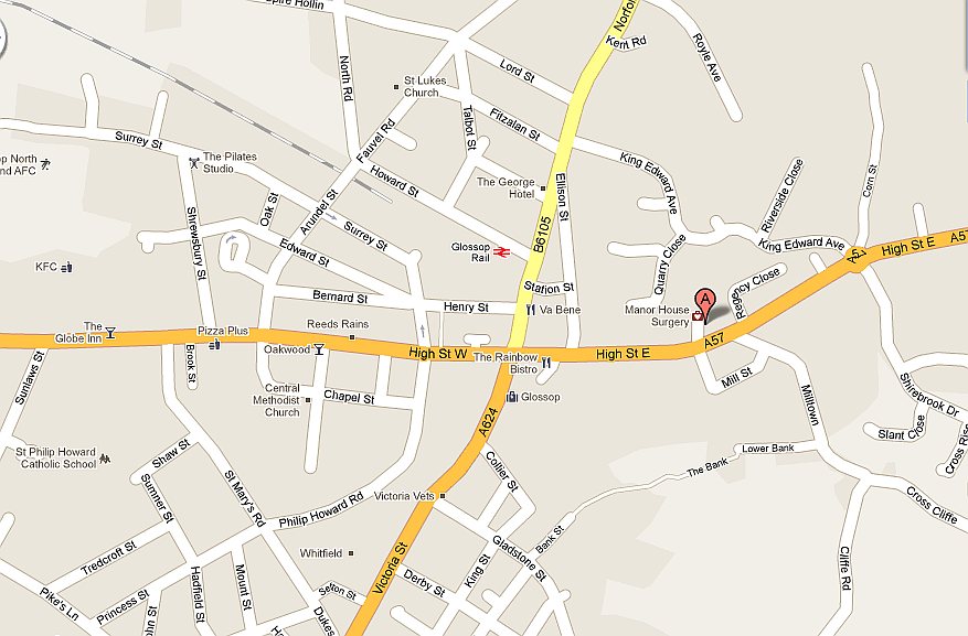Manor House Surgery Glossop is situated behind Cohens chemist. (A denotes the location of Manor House Surgery Glossop).